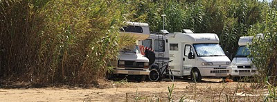Camuflados no meio de um denso canavial de folhas secas esvoaçando, encontravam-se várias autocaravanas estacionadas, numa atitude de manifesta imprudência e com indícios de estada prolongada, manifestada pelos “tapetes de cartão” de acondicionamento de frigoríficos que algumas exibiam a todo o comprimento lateral da porta da célula.