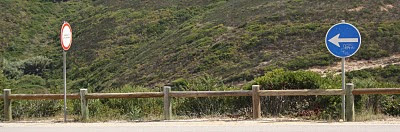 Que estará um sinal de “Obrigatório virar à esquerda” seguido de um “Trânsito proibido a autocaravanas”?